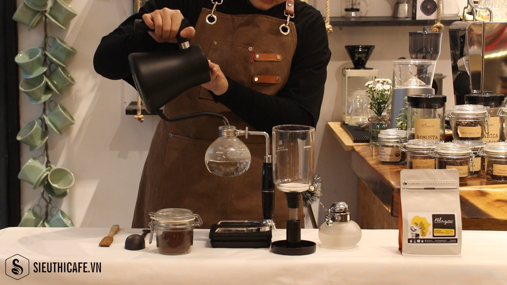 Cho nước nóng vào bình phía dưới của syphon để rút nhanhh quá trình pha và cà phê không tiếp xúc quá lâu với nước.