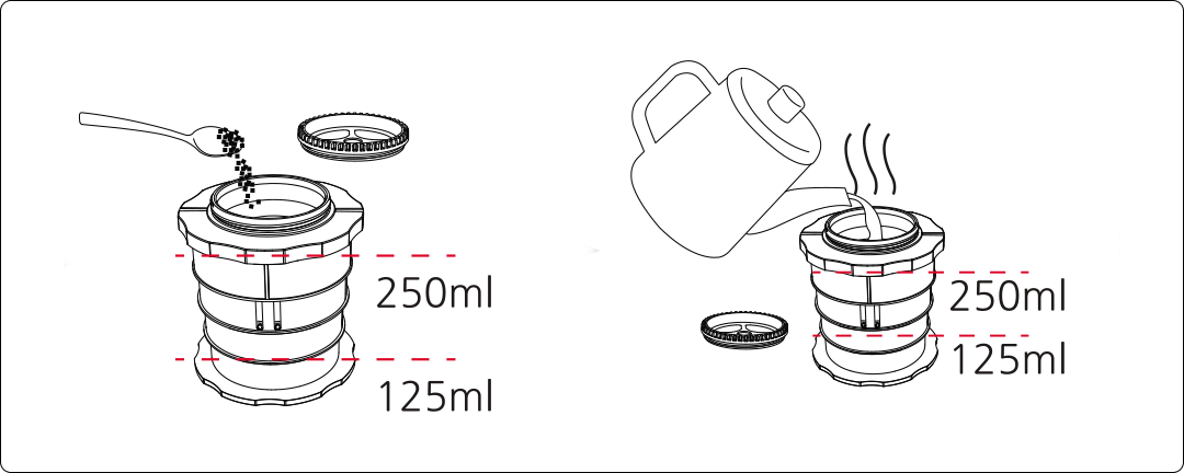Cho 10g-30g Cà phê bột vào Buồng chứa. Sau đó cho nước nóng vào.