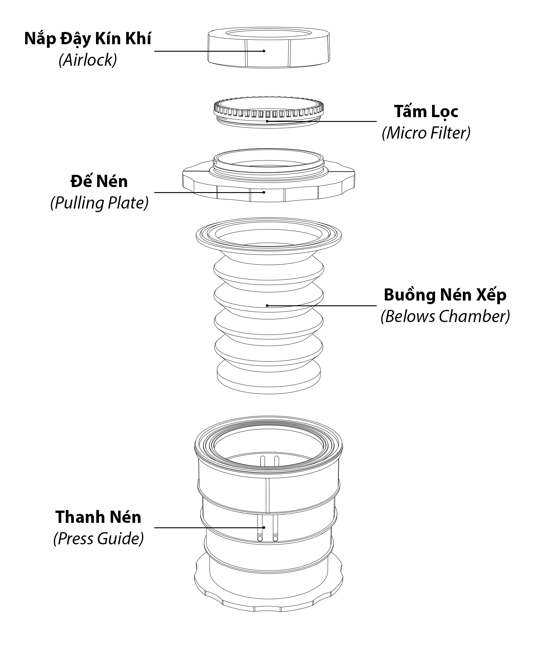 Nắp đậy che kín buồng áp suất để tránh cà phê bị rò rỉ khi nén.