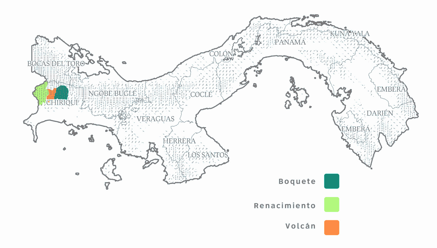 Các đồn điền cà phê ban đầu nằm ở các vùng ven biển, nhưng do độ cao thấp, các trang trại ban đầu bị sâu bệnh hoành hành, và việc canh tác nhanh chóng chuyển sang những nơi cao hơn. Ngày nay, ba vùng cà phê chính là Boquete, Volcán và Renacimiento, cả ba đều nằm ở tỉnh Chiriqui.