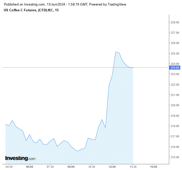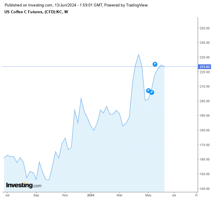 Biểu đồ giá cà phê Arabica sàn New York ngày 13/06/2024