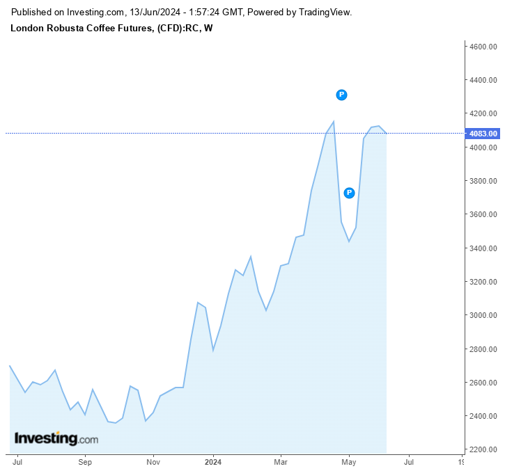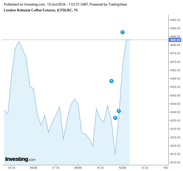 Biểu đồ giá cà phê Robusta Sàn London ngày 13/06/2024