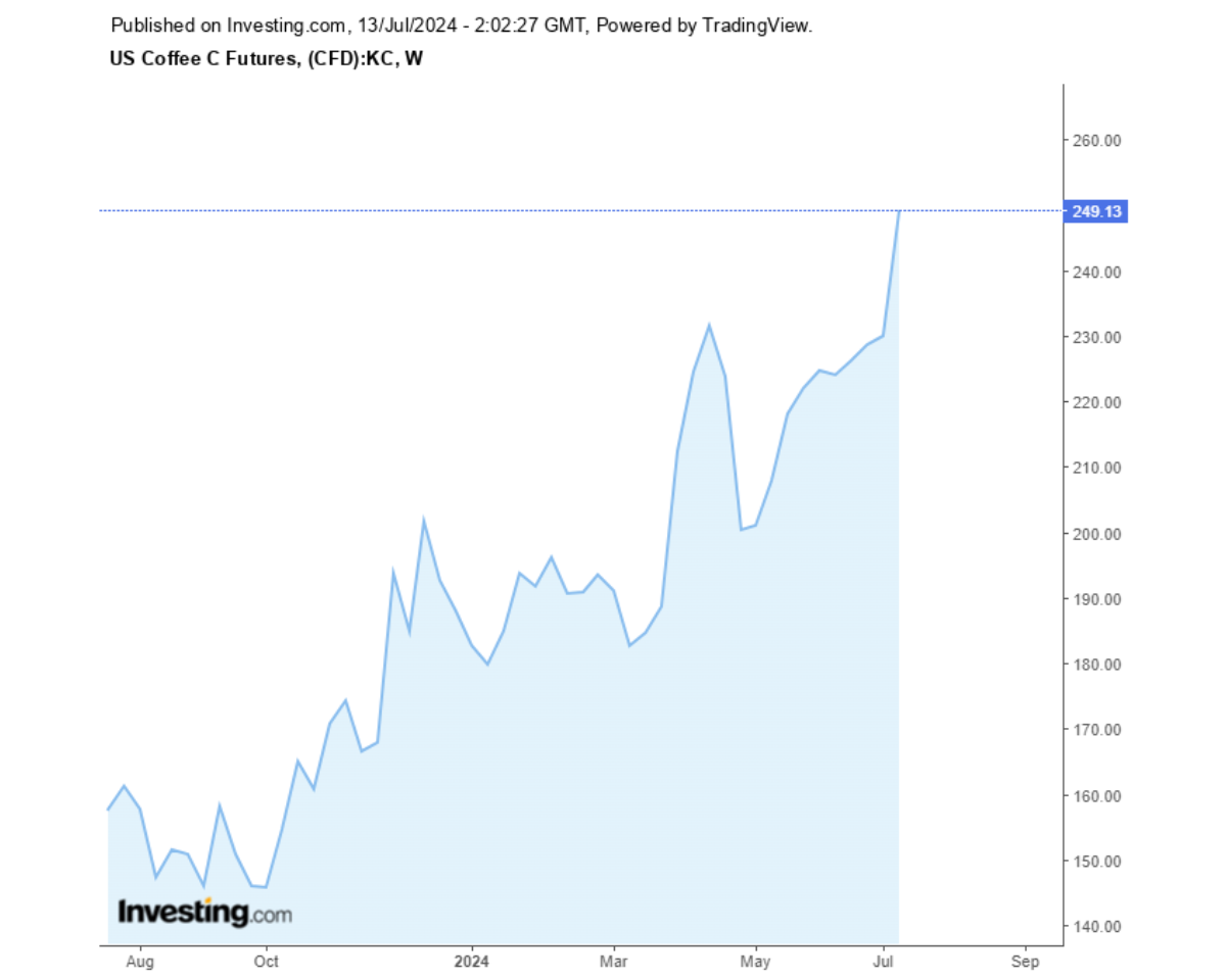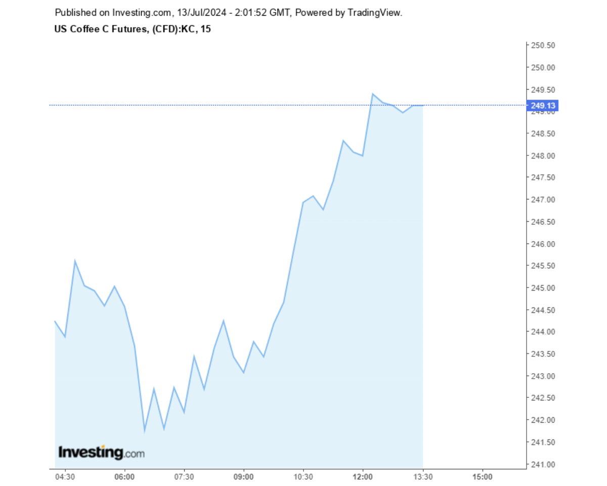 Giá cà phê Arabica hôm nay đạt mức 249,13 USD/10lb (khoảng 139,600 đồng/kg).