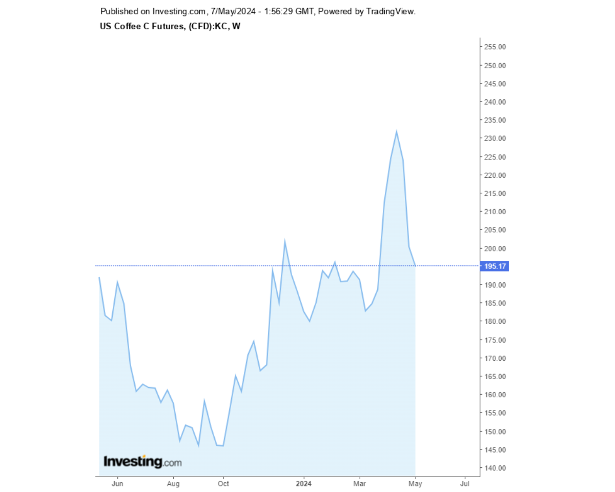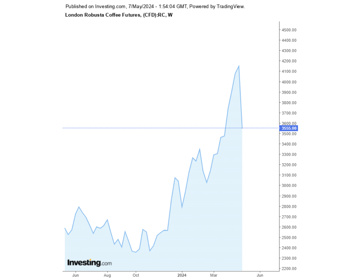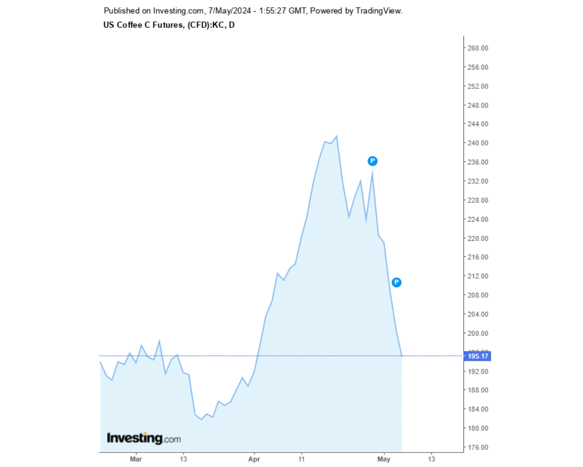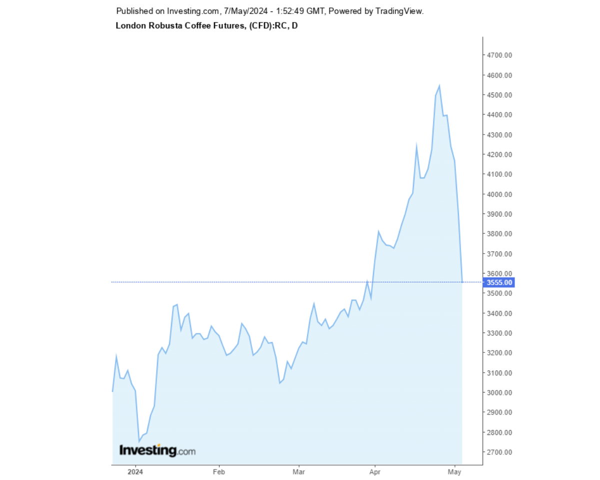 Giá cà phê Robusta sàn London và Arabica sàn New York 07/05/2024 tiếp tục giảm. Cùng Coffeenews cập nhật giá cà phê ngày hôm nay.