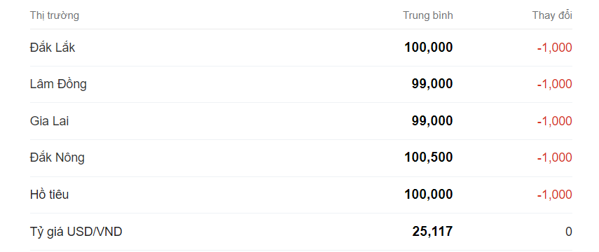 Giá cà phê hôm nay giảm mạnh trung bình đạt 99,800đ/kg đồng/kg, giảm 1,000 đồng so với ngày trước. Khu vực có giá cà phê cao nhất là Đắk Nông là 110,500 đồng/kg.