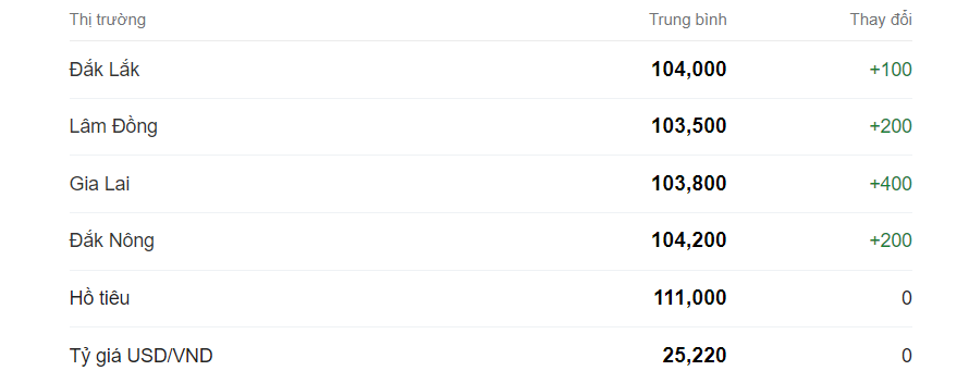 Giá cà phê hôm nay vẫn ở mức 104,000 đồng/kg, tăng 200đồng/kg so với hôm qua. Khu vực có giá cà phê cao nhất là Đắk Lắk là 101.500 đồng/kg.