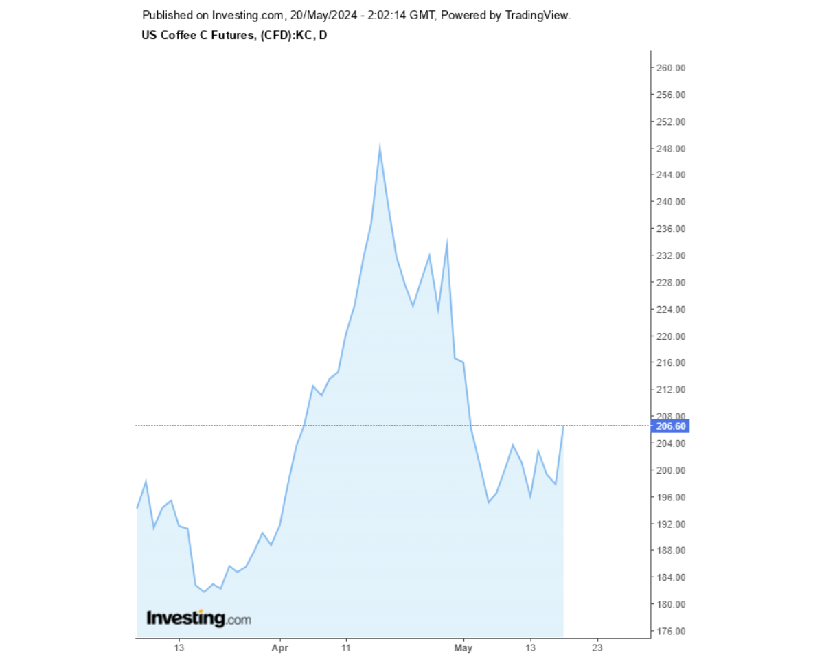 Giá cà phê Arabica hôm nay đạt mức 206,60 trên sàn New York, tương đương 4554USD/tấn (khoảng 116,000 đồng/kg)
