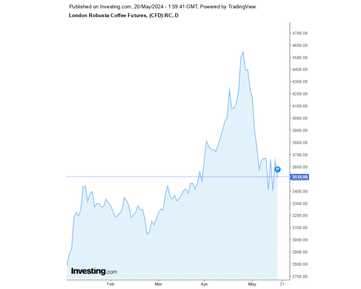 Giá cà phê Robusta hôm nay đạt mức 3518USD/tấn (khoảng 89,554 đồng/kg)