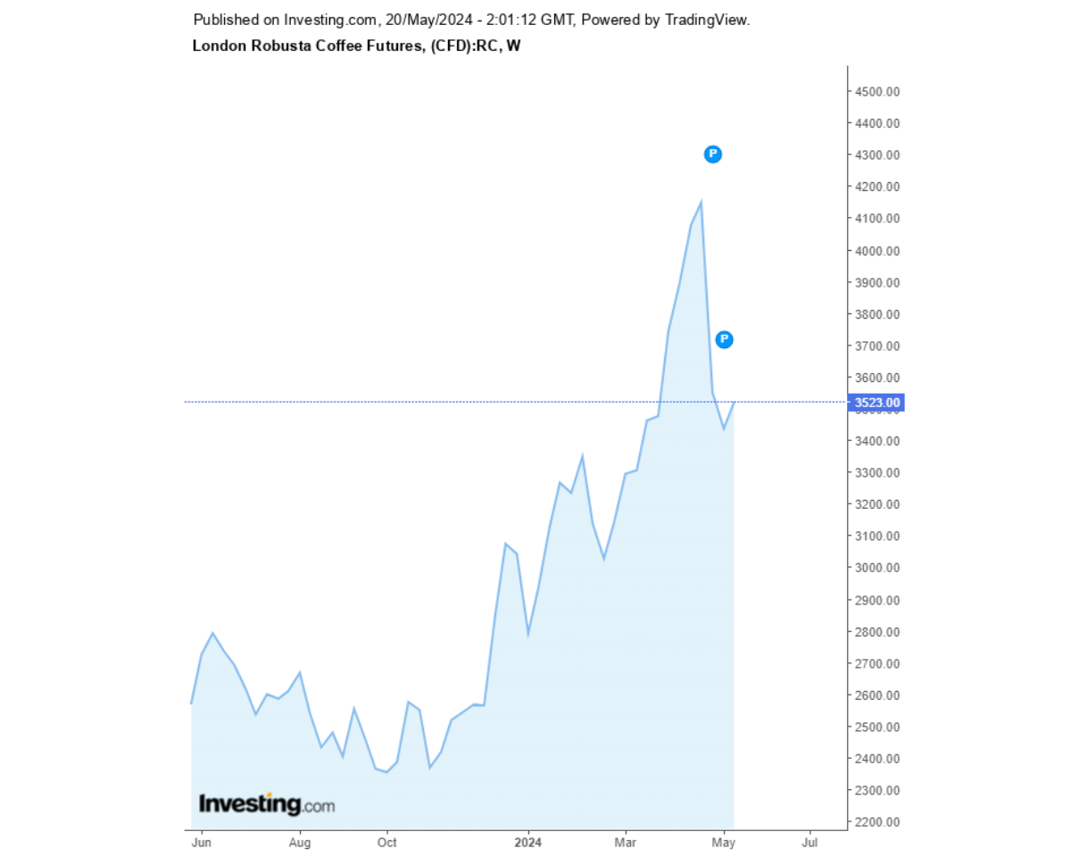Giá cà phê Robusta sàn London và Arabica sàn New York 20/05/2024 đang ở mức ổn đinh. Cùng Coffeenews cập nhật giá cà phê ngày hôm nay.