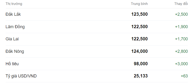 Giá cà phê hôm nay vẫn ghi nhận ở mức cao kỉ lục, trung bình đạt 123,300 đồng/kg, tăng 2,300 đồng so với ngày trước. Khu vực có giá cà phê cao nhất là Đắk Nông với 124,000 đồng/kg.
