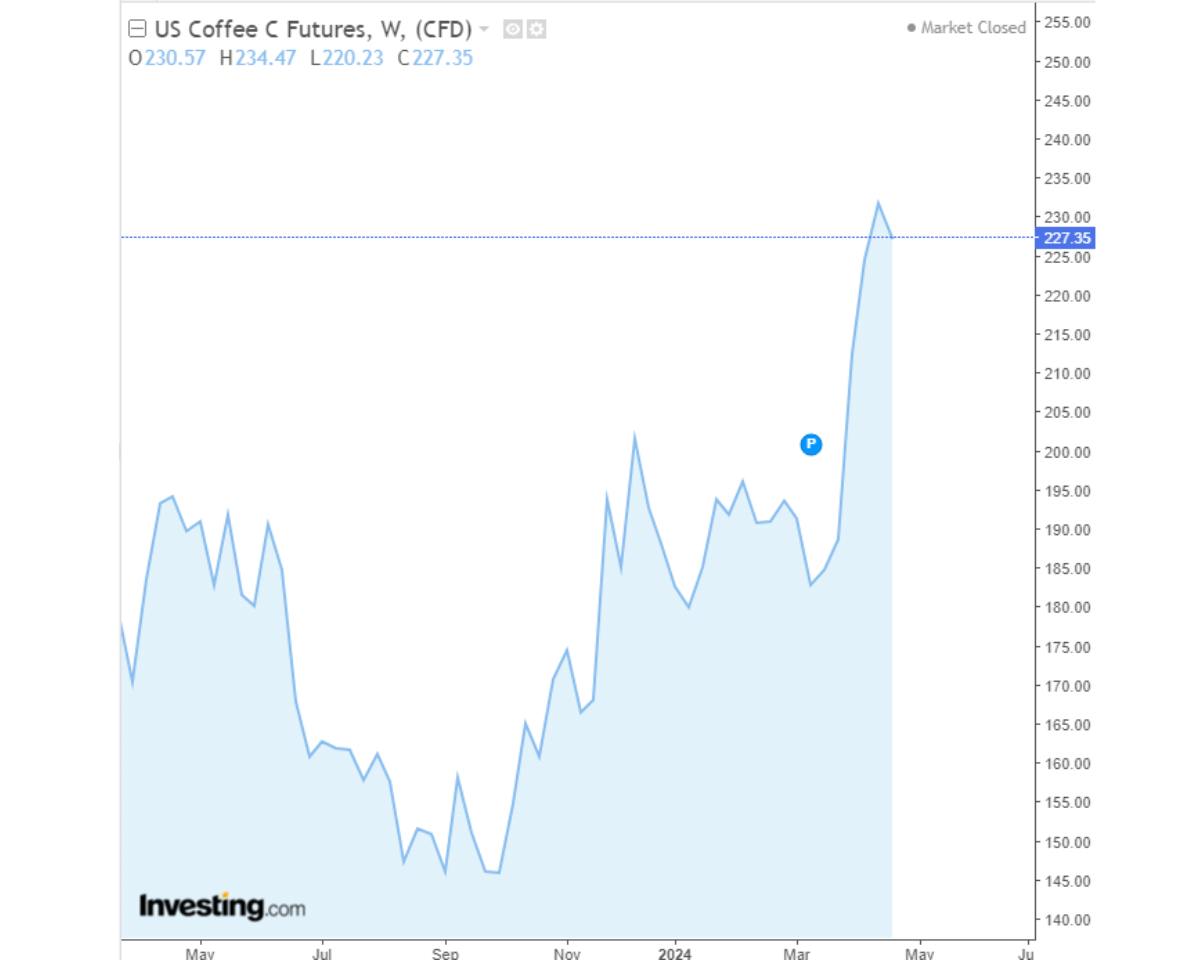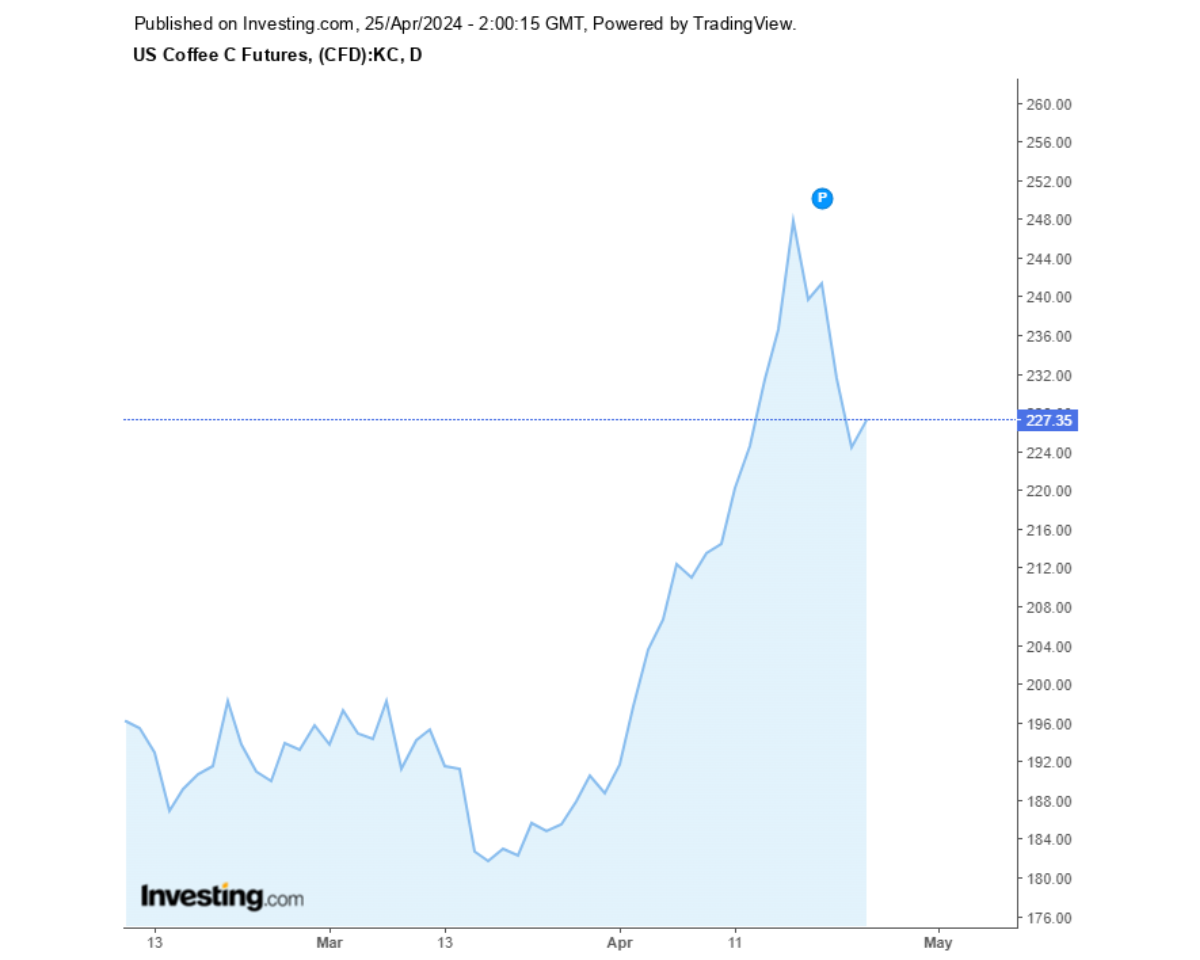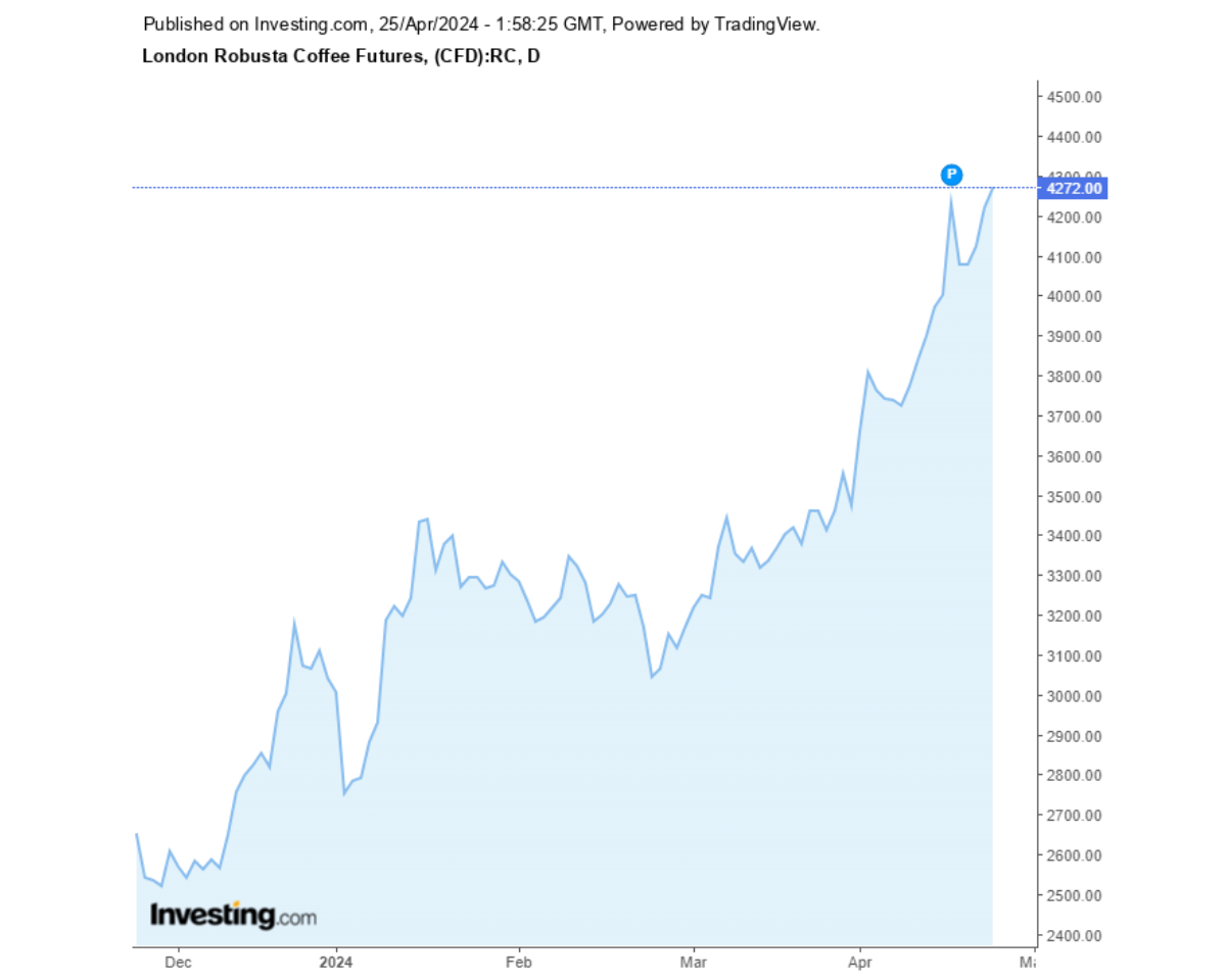 Giá cà phê Robusta sàn London và Arabica sàn New York 25/04/2024 tăng so với ngày hôm trước. Cùng Coffeenews cập nhật giá cà phê ngày hôm nay.