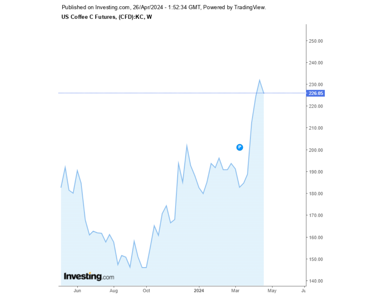 Giá cà phê Arabica hôm nay đạt mức 226,05 trên sàn New York, tương đương 4993,46USD/tấn (khoảng 125,520 đồng/kg)