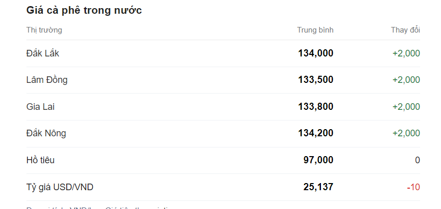 Giá cà phê hôm nay tiếp tục ghi nhận tiếp tục tăng, trung bình đạt 134,000đ/kg đồng/kg, tăng 2000 đồng so với ngày trước. Khu vực có giá cà phê cao nhất là Đắk Nông đã lên đến 134,200 đồng/kg.
