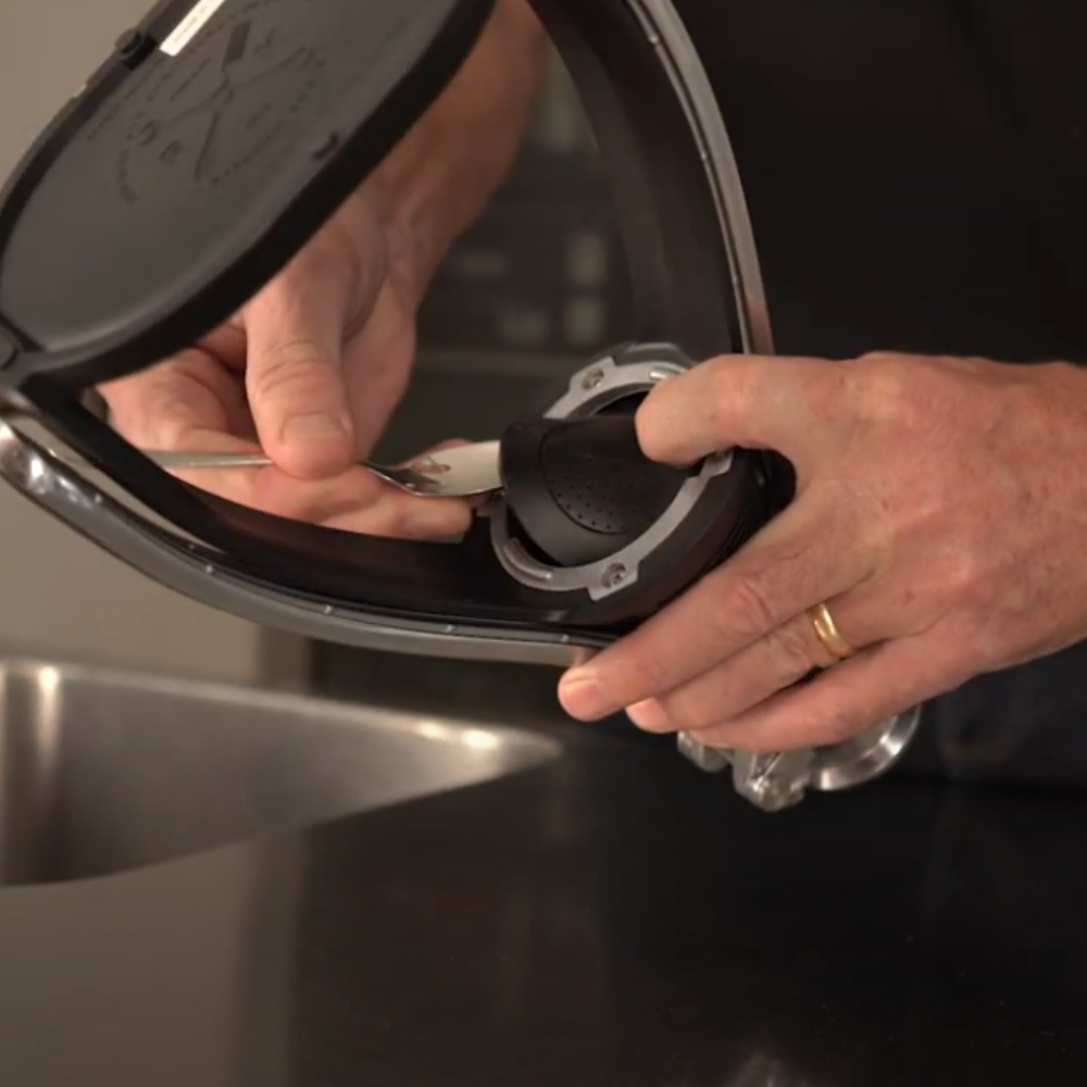 - Bước 1: Tháo vòng vòng đệm silicone (đĩa đen có lỗ) và nâng cả hai tay cầm lên.