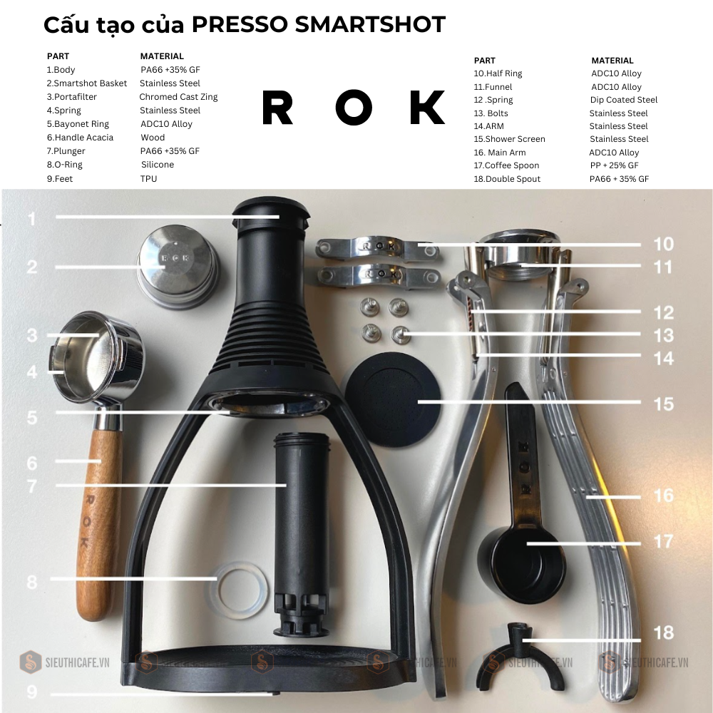 ROK Presso Smartshot được nâng cấp với bộ đôi lò xo, giúp giảm sức ép và lực đẩy nhẹ nhàng hơn. Với thiết kế cổ điển, chất liệu nhựa PA66 + 35% GF giúp máy nhẹ và dễ di chuyển. Tay cầm Portafilter bằng gỗ tăng thêm sự sang trọng.