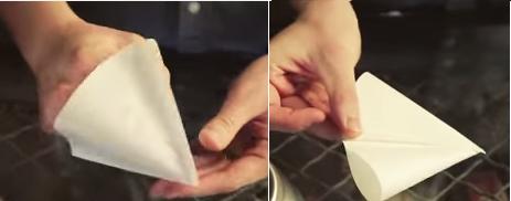 Bước 3: Gấp giấy lọc dọc theo đường kẻ chấm, đặt vào phễu. Sử dụng giấy lọc (filter paper) Hario V60 nếu pha từ 1-2 ly.