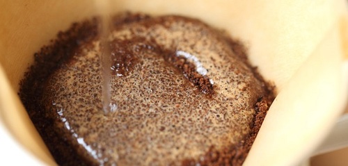 Bước 6: Châm khoảng 20ml nước lọc đã được đun sôi lên bề mặt cà phê. Đổ cà phê theo hình xoắn ốc từ trong ra ngoài phê (không đổ lên giấy lọc). Ủ cà phê trong vòng 30 giây để cà phê nở ra và hòa trộn với nước, đồng thời giải phóng một lương không khí bên trong cà phê ra ngoài.