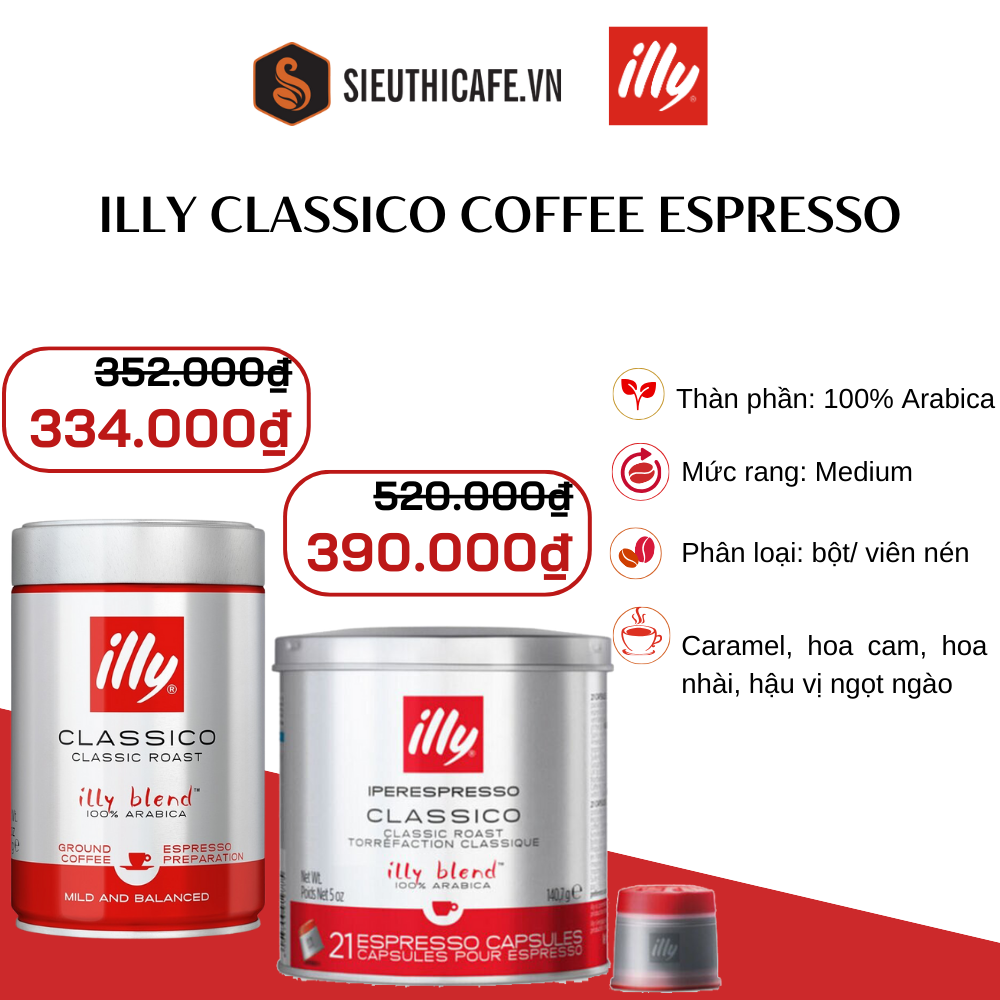 Cà phê Illy đặc biệt nổi tiếng với espresso, với nhiều sản phẩm đa dạng từ cà phê rang xay đến cà phê viên nén, đáp ứng nhu cầu của mọi tín đồ yêu thích cà phê. Hãy cùng Sieuthicaphe.vn khám phá những hương vị độc đáo, tinh tế của cà phê Illy với những ưu đãi siêu sốc lên đến 40%.
