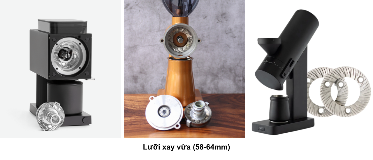 - Phổ biến trong máy xay dành người dùng chuyên nghiệp như Akirakoki M-520A (60mm), Fellow ODE (64mm), Pressoco DF64, DF64V (64mm), Acaia Orbit (64mm) …