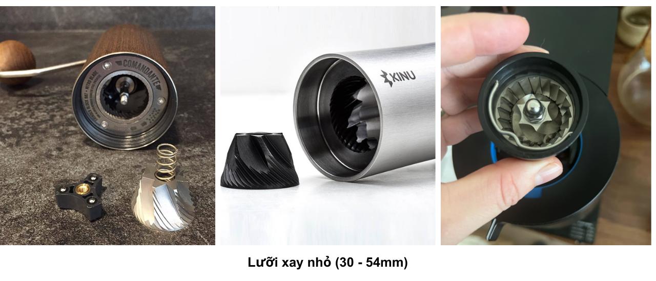 - Thường được dùng cho máy xay cà phê gia đình cối xay cà phê thủ công như Pressoco Guru Pro (38mm), Fellow Opus (40mm), Kinu M47 (47mm), Comandante C40 (39mm), C60 (60mm), …