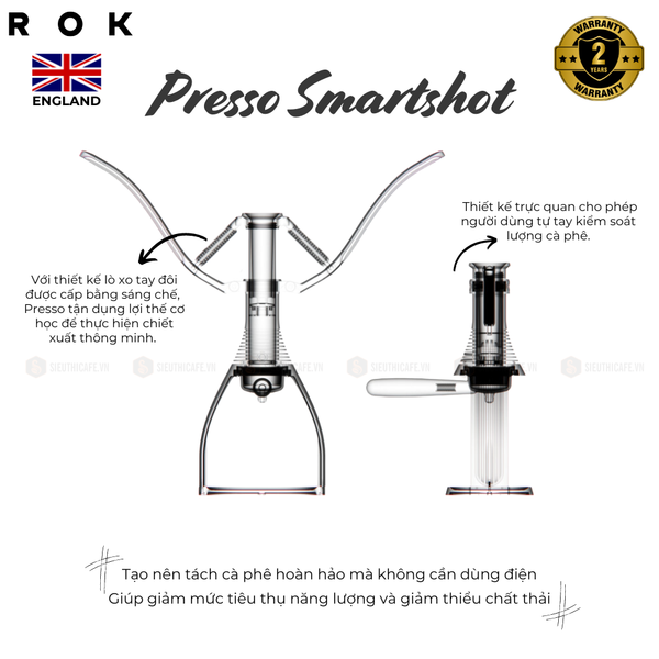 Máy pha cà phê thủ công ROK Presso Smartshot là máy pha cà phê espresso thủ công đơn giản và sáng tạo, giúp bạn dễ dàng tạo ra tách espresso hoàn hảo chỉ với cà phê và nước. Được nâng cấp với bộ đôi lò xo, máy giảm sức ép khi pha chế, cho lực đẩy nhẹ nhàng hơn.