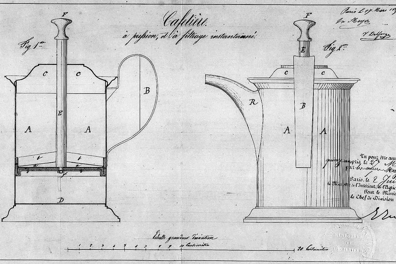 Thiết kế đầu tiên cho phong cách pha chế này đã được cấp bằng sáng chế vào năm 1852 bởi người Pháp Mayer và Delforge. Nó có bộ lưới lọc bên trong bình về cơ bản nó không giống như bạn biết ngày nay. Và đến năm 1929 – người Ý Attilio Calimani và Giulio Moneta đã cải tiến và thiết kế lại cho ra bình french press hoàn chỉnh được cấp bằng sáng chế. Ngày nay, có rất nhiều loại bình pha french press để bạn lựa chọn nhưng chúng có chung những thiết kế cơ bản của một bình pha french press.