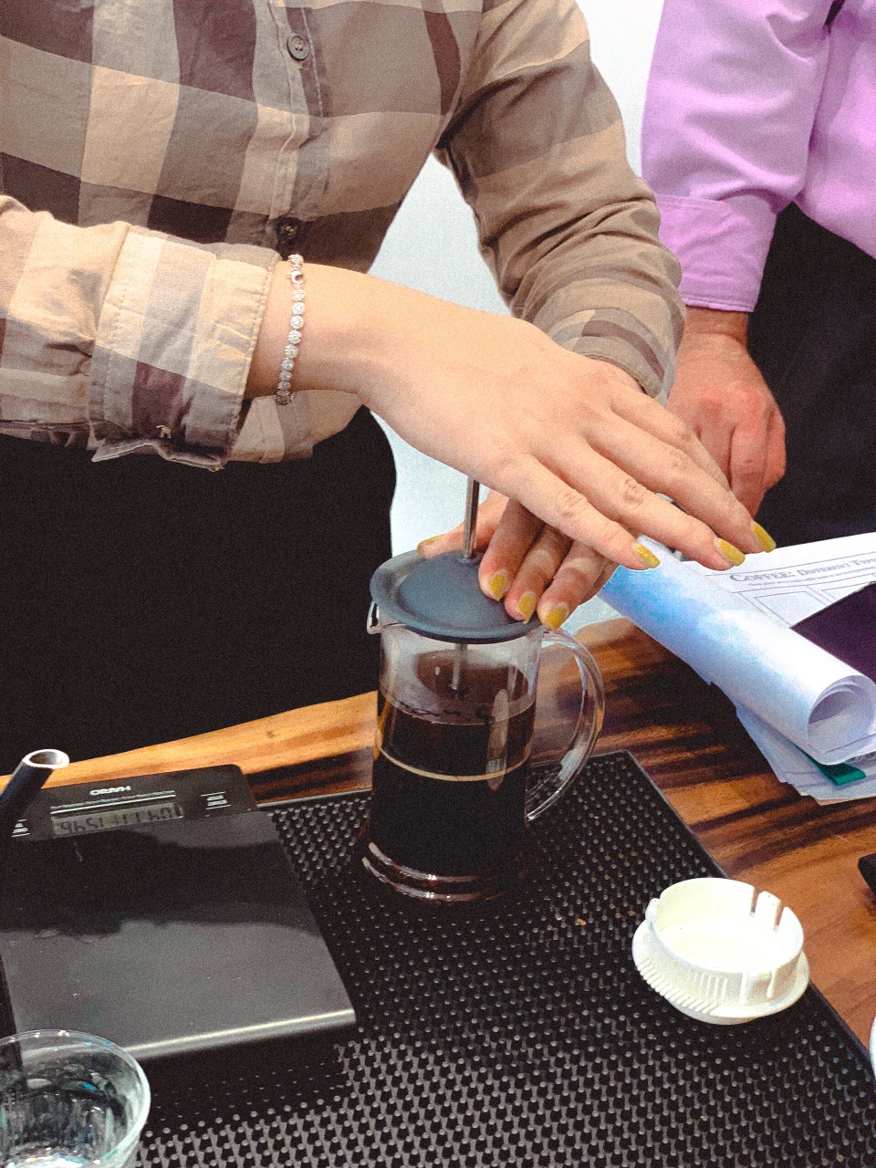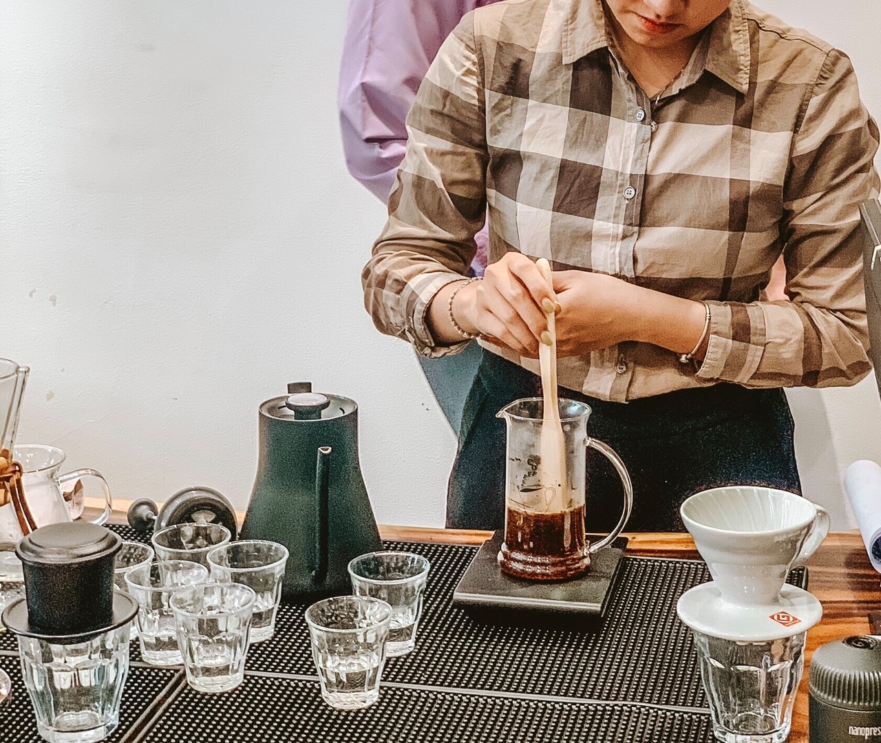 - Cân điện tử : sử dụng cân điện tử để cân chính xác khối lượng cà phê, lượng nước và thời gian