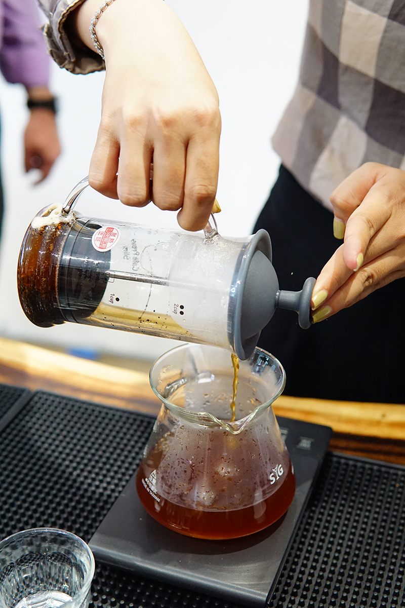 Bước 6: Chờ thêm 20 giây và bắt đầu Nén bộ lọc xuống từ từ để đẩy lượng cà phê xuống đáy bình thông qua màng lọc. Lúc này chỉ còn nước cà phê ở phía trên.