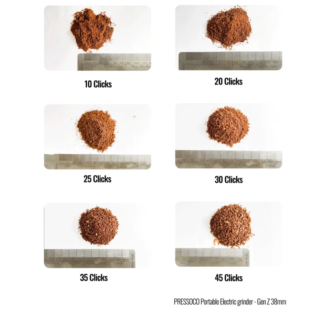 - Máy xay điện PRESSOCO Gen Z được trang bị một lưỡi xay hình nón mạ titan sáu lưỡi cắt 38mm có thể xay ở tất cả các mức xay từ Espresso đến Pour-Over